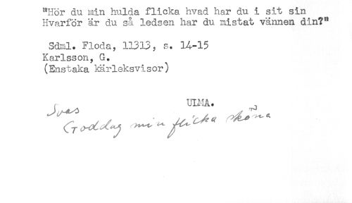//// **nor au mm nuj.o.a -L J-JLn v au. nar uu. JL s-n; s //// Hvarfor är du så ledsen har du nistat vännen din?" //// Sdml. Flöda, 11313, s. 14-15 //// Karlsson, G. //// (Enstaka kärleksvisor) ////