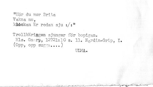 //// ^Hör du mor Brita //// Vakna nu, //// kMckan är redan sju //// Trollkäriggen sjunger för bopigan. //// Hls. Gnarp, 12721:10 s. Il/Nordin-Grip, 1. //// (Opp, opp sugga*...) ////