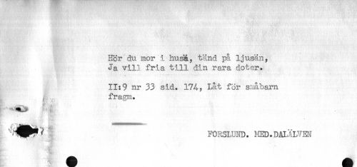 //// Hör du mor i husa, tand på ljusan, //// Ja vill fria till din rara doter. //// * //// 11:9 nr 33 sid. 174, Ht for småbarn //// fragia. //// k //// FORSLUND. HED.DALÄLVEN //// Br Jff' //// - //// '--THP^r ////