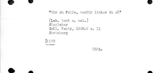 //// "Hör du Pelle, varför linkar du så" //// (Lek. text o. mel.) //// Sånglekar //// Snål. Vexiö, 2303:6 s. 11 //// Strömberg //// &199 //// ULMA. ////