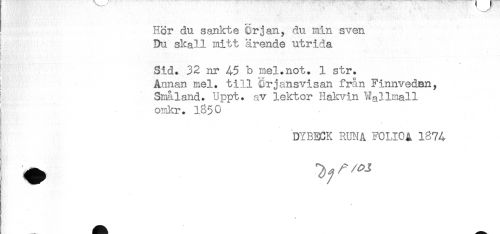 //// Hör du sankte Crjan, du min sven //// Du skall mitt ärende utrida //// Sid. 32 nr 45 b mel.not. 1 str. //// Annan mel. till Orjansvisan från Finnveden, //// Småland. Uppt. av lektor Hakvin Wallmall //// omkr. 1850 //// ] DYBECK RUNA FOLICA 1874 //// t ^ //// < ////