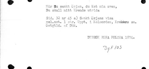 //// Hor Bu sankt er j an, du a st min sven. //// Du skall mitt ärende utrida //// - //// Sid. 32 nr 45 a) S.?nkt Qrjans visa //// mel.not. 1 str. Uppt. i Kolmorden, Krokärs sn. //// astgtld. af Dbk. //// DYBECK RUNA FOLIOA 1874* ////