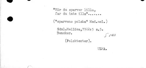 //// < //// j "Hör du spader lilla, //// far du inte illa^....... //// ^^ ("sparvens polska" Med.mel.) //// ' SdHil.Meilösa,7922:5 s.5. //// Dencker. ^^ //// (Polsktexter). //// ! //// UD^lÅ. //// i //// i //// < //// t //// t //// ! //// < //// t ////