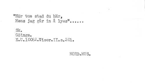 //// A //// "Hor tue stad du här. //// Mens jag gar in å lyes"...... //// Sk. //// Goinge. //// E.U. 10aS2.Visor.il. s.201. //// NORD.MUS. ////