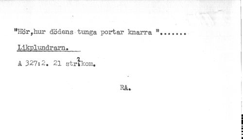 //// "Hor,hur dödens tunga portar knarra //// Likplundrarn* //// Å 327:2. 21 strtkom. //// v //// RÅ. //// ^ //// H //// H //// ] //// s //// H ////