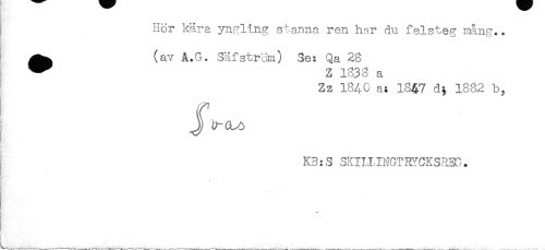 //// Hor kära yngltng stanna ren har du felsteg mån,<?.. //// f //// ^^ (av Ä.G. 3äfström) 3e: Qa 28 //// ; " Z 1838 a //// Zz 18/,0 a; 1847 d; 1882 b, //// KB:S SKIH.INGTRYCKSnm. //// ' ////