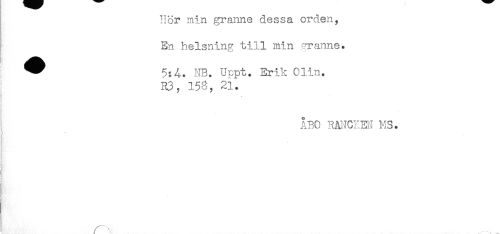 //// Hor min granne dessa orden. //// En helsning till min granne. //// T-.-' - //// ) //// ^ 5:4. NB. Urpt. Erik Olin. //// 33, 158, 21. //// j //// ! ÅBO RANCZE3 MS. //// . //// . //// ZM //// ! ^ ////