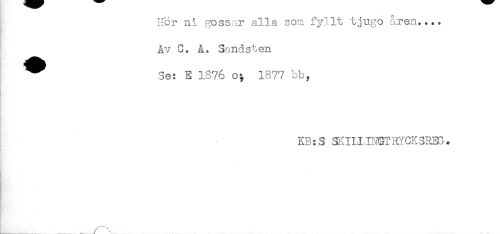 //// Hor ni gossar alla som fyllt tjugo åren.... //// Av C. A. Sandsten //// ^ 3e: E 1876 o; 1877 bb, //// t //// i, . //// KB: 3 SKILLIN&TRYCKSREG. //// . //// L____ ______ r^ ////
