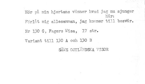 //// Hor på min hjertans vänner hvad jag nu sjunger //// Kär: //// Förlåt mig allesamman, jag komaer till besvär. //// Nr 130 C, Fagers Wisa, 17 str. //// Variant till 130 A och 130 B //// S^E GJfLÄNDSKA VISOR ////