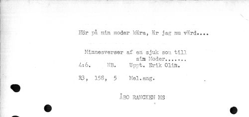 //// . //// Hör på min moder kära, är jag nu värd.... //// h //// Minnesverser af en sjuk son till //// sin Moder....... //// 4:6. NB. Uppt. Erik Olin. //// R3, 158, 5 Mel.ang. //// ÅBO RMCKEN HS //// } ^ * ////
