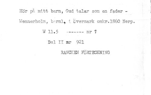 //// Hör på mitt barn, Gud talar som en fader - //// Wennerholm., b^-rnl, i evermark omkr.1860 Nerp. ; //// W 11.5 - - nr ? I //// Del II sr 921 //// RANCKEM ^HTECKNING ////