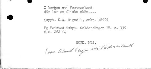 //// I bergen uti Vestmanland //// där bor en flicka skon.... //// ^ (uppt. K.A. Rignell, onlcr. 1890) //// ) //// Vg Fristad Mskpt. Soldatsr.ii"er IV. s. 339 //// E.U. 282 04 //// S //// NORD. MUS. ////