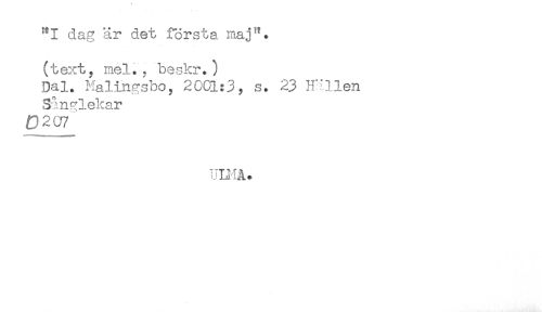 //// dag är det första maj^. //// (text, mel., beskr.) //// Dal. Malingsbo, 2001:3, s. 23 H"*llen //// Sånglekar //// 0207 //// UUIA. ////