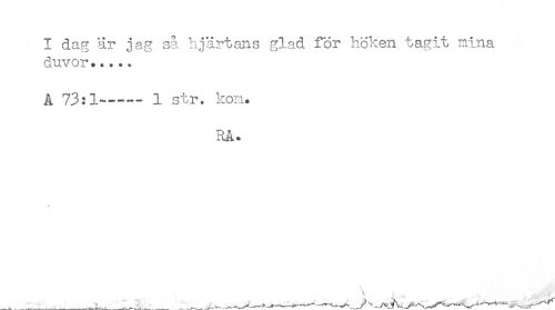 //// I dag är jag så hjärtans glad för höken tagit mina //// duvor.... * //// A 73:1--- 1 str. kon. //// RÅ. ////