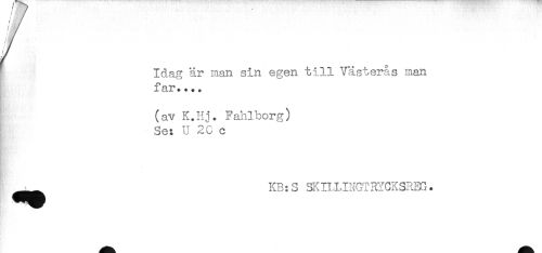 //// Idag är man sin egen till Västerås man //// far.... //// (av K.Hj. Fahlborg) //// Se: U 2C c //// ^^ KB:S SKILLINGTRYCKSREG. ////