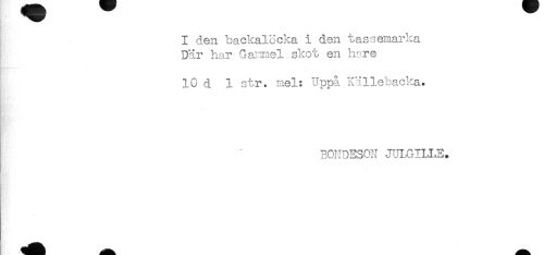 //// I den backalöcka i den tassemarka //// Där har Gammel skot en hare //// 10 d 1 str. mel: Uppå Källebacka. //// BONDESON JULGILI,E. ////