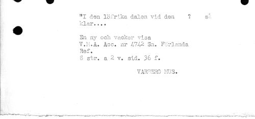 //// den löirika dalen vid den ? så //// ; klar.... //// En ny ock vacker visa //// V.M.A. Acc. nr 4742 Sn. Forlanda //// Ref. //// 8 str. a 2 v. sid. 36 f. //// VAR^ERG MUS. ////