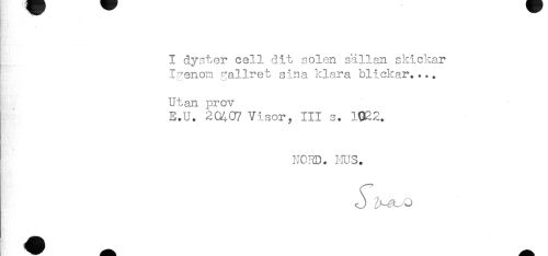 //// I dyster cell dit solen sällan skickar //// Igenom gallret sina klara blickar.... //// . //// Utan prov //// E.U. 20407 Visor, III s. 1022. //// N03D. HUS. ////
