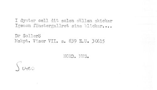 //// I dyster cell dit solen sällan skickar //// Igenom fönstergallret sina blicksr.... //// Dr Sollero //// Mskpt. Visor VII. s. 839 E.U. 3(&15 //// NCRD. ms. ////