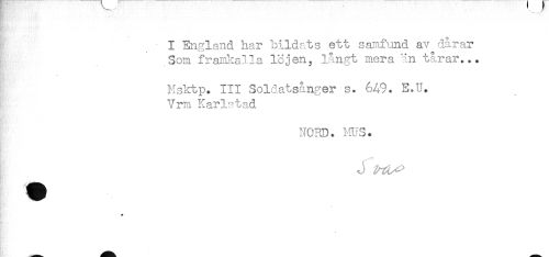 //// I England har bildats ett samfund av dårar //// Som framkalla löjen, långt mera än tårar... //// Msktp. III Soldatsånger s. 6A9. E.U. //// Vrm Karlstad //// NOPD. ms. //// I J ////