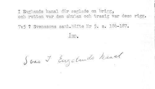 //// I Englands kanal där seglade en hrigg, //// och rutten var den skutan och trasig var dess rigg. //// 7:5 ? Svenssons sanl.häfte Nr 5. s. 186-137. i //// ÅBO. //// i //// < ////