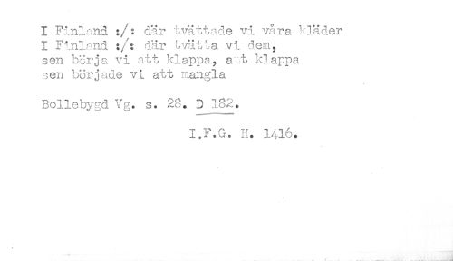 //// I Finland :/: där tvättade vi våra kläder //// 1 Finland :/: där tvätta vi dem, //// sen börja vi att klappa, a t klappa //// sen började vi att mangla. //// Bollebygd Vg. s. 28. D 182. //// I.F.G. E. 1416. //// ........----.- . ^ .r . , ______ _____ ___J ////