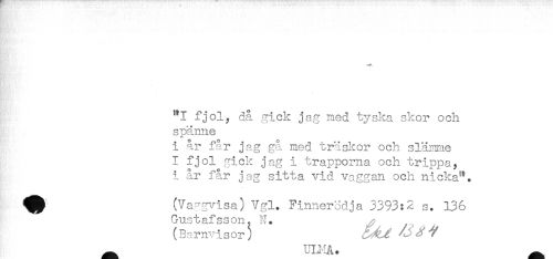 //// . //// fjol, då gick jag med tyska skor och //// spänne //// i år får jag gå med träskor och slämme //// I fjol gick jag i trapporna och trippa, //// i år får jag sitta vid vaggan och nicka". //// ^ (Vaggvisa) Vgl. Finnerödja 3393:2 s. 136 //// Gustafsson. N. ^ y //// (Barnvisor; ^ ^ //// ^ UU-iÅ. ^ ////