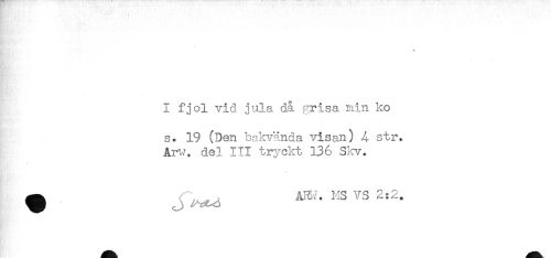 //// - //// I fjol vid jula då grisa min ko //// s. 19 (Den bakvända visan) 4 str. //// Arw. del III tryckt 136 Skv. //// * //// HB //// ^ . ^ ^^ ARM*. MS VS 2:2. ////