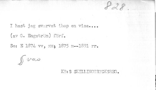 //// I hast jag svarvat ihop en visa.... //// (av G. Engström) förf. //// Se: E 1874 w, xx; 1875 m-1891 rr. //// y //// KB: S SHLLINGTRYCKSRBG. //// i //// ! //// ! //// b //// I //// - ////