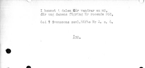 //// I hemmet i. dalen äär vandrar en mö, //// där ung damens fägring är ros ende röd, //// 6:4 ? Svenssons saml.häfte Nr 2. s. 6. //// ÅBO. ////