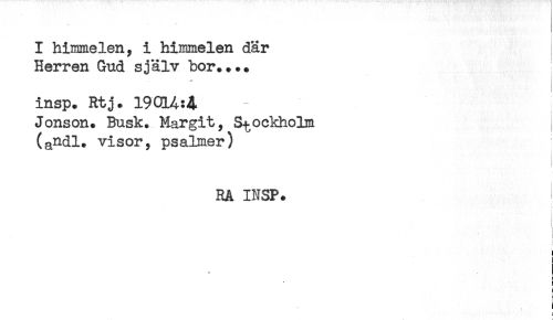 //// I himmelen, i himmelen där //// Herren Gud själv bor.... //// insp. Rtj. 19014:4 //// Jonson. Busk. Margit, Stockholm //// (a&dl. visor, psalmer) //// RA INSP. //// t //// ** //// < //// I ////