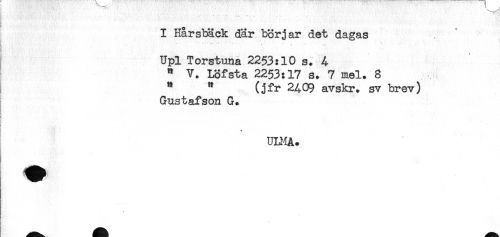 //// I Hårsback där börjar det dagas //// - ** - j - . - - //// Upl Torstuna 2253:10 s. 4 //// " V. LSfsta 2253:17 s. 7 mel. 8 //// " " (jfr 2A09 avskr. sv brev) //// Gustafson G. //// ! - , //// ULMA. ////