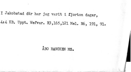//// w //// I Jakobstad där har jag varit i fjorton dagar, //// A:A KB. Uppt. Wefvar. R3,165,121 Mel. R6, 191, 91. //// ÅBO RåNCKEN MS. ^ ////