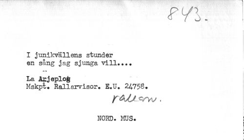 //// I junikvällens stunder //// en sång jag sjunga vill.... //// La Apjeplojt; //// Mskpt. Rallarvisor. E.U. 24758. //// NORD. MUS. ! //// i ////
