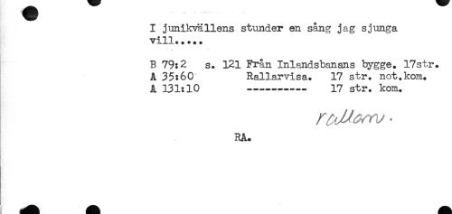 //// ^(HHHHHHt ...- //// I junikvällens stunder en sång jag sjunga //// vill..... //// B 79:2 s. 121 Från Inlandsbanans bygge. 17str. //// A 35:60 Rallarvisa. 17 str. not.kom. //// A 131:10 -------- 17 str. kom. //// RA. ////