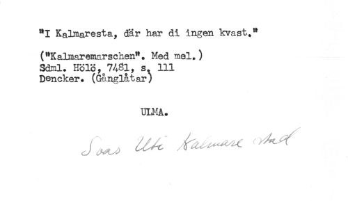 //// **I Kalmaresta, där har di ingen kvast." //// ("Kalmaremarschen". Med mel.) //// Sdml. H51S,^7A8l, s. 111 //// Dencker. (Gånglåt ar) //// ULMA. ////