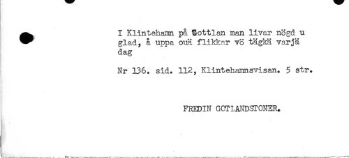 //// ^^ I Klintehamn på !&ottlan man livar nögd u //// ^^ glad, å uppa ouä flikkar vS täghä varjä //// dag //// Nr 136. sid. 112, Klintehamnsvisan. 5 str. //// B ^ //// i //// t; //// . //// FREDIN GOT I,ANDSTONER. //// t , //// & ////