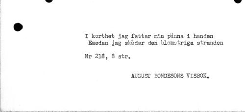 //// I korthet jag fattar min panna i handen //// Emedan jag skådar den blomstriga stranden //// Nr 218, 8 str. //// AUGUST BONDESONS VISBOK. ////