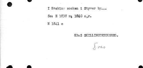 //// I Koskins socken i Styver by... //// Se: E 1838 m; 1840 o,r. //// N 18A1 c //// KB:S SKILHNGTRYCK3RBG. ////