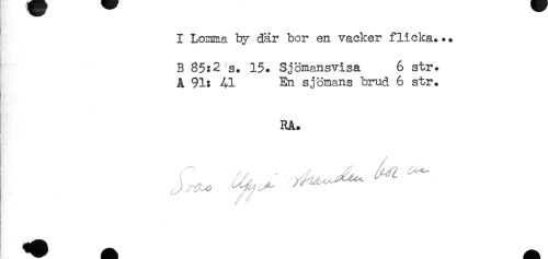 //// I Lomma by dar bor en vacker flicka... //// B s. 15. Sjömansvisa 6 str. //// Å 91: Al En sjömans brud 6 str. //// RA. ////