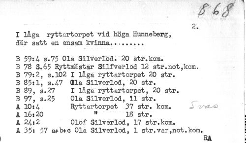 //// .............." . " " ' 2. //// I låga ryttartorpet vid höga Hunneberg, //// där satt en ensam kvinna......... //// ; //// B 59:4 s.75 Ola Silverlod. 20 str.kom. //// B 73 S.65 Ryttmästar Silfverlod 12 str.not,kom. //// B 79:2, s.102 I låga ryttartorpet 20 str. //// B 85:1, s.47 31a Silverlod, 20 str. //// B 89, s.27 I låga ryttartorpet, 20 str. //// B 97, s.25 Ola Silverlod, 11 str. //// A 10:4 Ryttartorpet 37 str. kom. //// A 16:20 " 18 str. //// A 24:2 Olof Silverlod, 17 str.kom. ; //// A 35: 57 a+bt-c Ola Silverlod, 1 str.var,not.kom. : //// i Rå ////