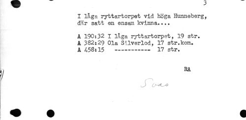//// I låga ryttartorpet vid höga Hunneberg, //// där satt en ensam kvinna.... //// A 190:32 I låga ryttartorpet, 19 str. //// A 382:29 Ola Silverlod, 17 str.kom. //// A 458:15 ........... 17 str. //// ^ Rå //// ål ^ ^ th ål ////