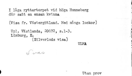 //// I låga ryttartorpet vid höga Hunneberg //// där satt en ensam kvinna //// (Visa fr. Västergötland. Med många luckor) ^ //// .'.... * t* //// t= //// Upl. Västlanda, 20672, s.1-3. ! //// Limburg, E. /t //// (Silverlods visa) j //// UniA j //// * //// f 11+,tan nvnv ////