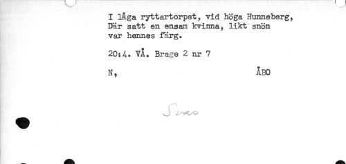 //// I laga ryttartorpet, vid höga Hunneberg, //// Där satt en ensam kvinna, likt snön //// var hennes färg. //// " //// 20:4. VÅ. Brage 2 nr 7 //// . //// N, ÅBO //// H //// t. < ^ ////