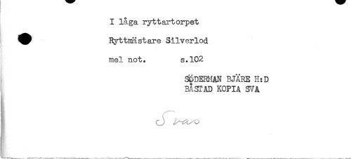 //// Q //// I laga ryttartorpet //// ^^ Ryttmästare Silverlod //// < //// mel not. s.102 //// S&DEKMAN BJARE H:D //// BÅSTAD KOPIA SVA ////