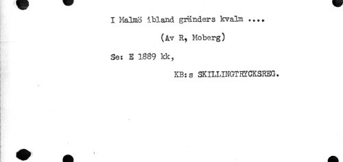 //// I Malmö ibland gränders kvalm .... //// (åv R, Moberg) //// Se: E 1889 kk, //// KB:s SKILLINGTRYCKSREG. //// '. . *** ////