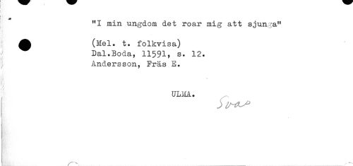 //// ! //// "I min ungdom det roar mig att sjunga" //// ^ (Mel. t. folkvisa) //// Dal.Boda, 11591, s. 12. //// Andersson, Fräs E. //// j) //// { //// uLm. ////
