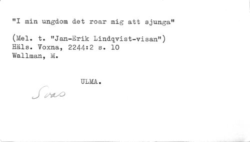 //// "I min ungdom det roar mig att sjunga" //// (Hel. t. "Jan-Erik Lindqvist-visan") //// Häls. Voxna, 2244:2 s. 10 //// Wallman, M. //// ULMA. //// J ////