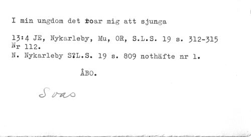 //// I min ungdom det toar mig att sjunga //// 13:4 JE, Nykarleby, Nu, OR, S.L.S. 19 s. 312-315 //// Nr 112. //// N. Nykarleby S2L.S. 19 s. 809 nothäfte nr 1. //// ÅBO. //// . .--o ////
