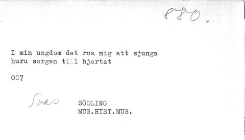 //// ! //// I min ungdom det roa mig att sjunga //// huru sorgen till hjertat //// 007 //// i //// < //// y' SÖDLING //// MUS.HIST.MUS. ////